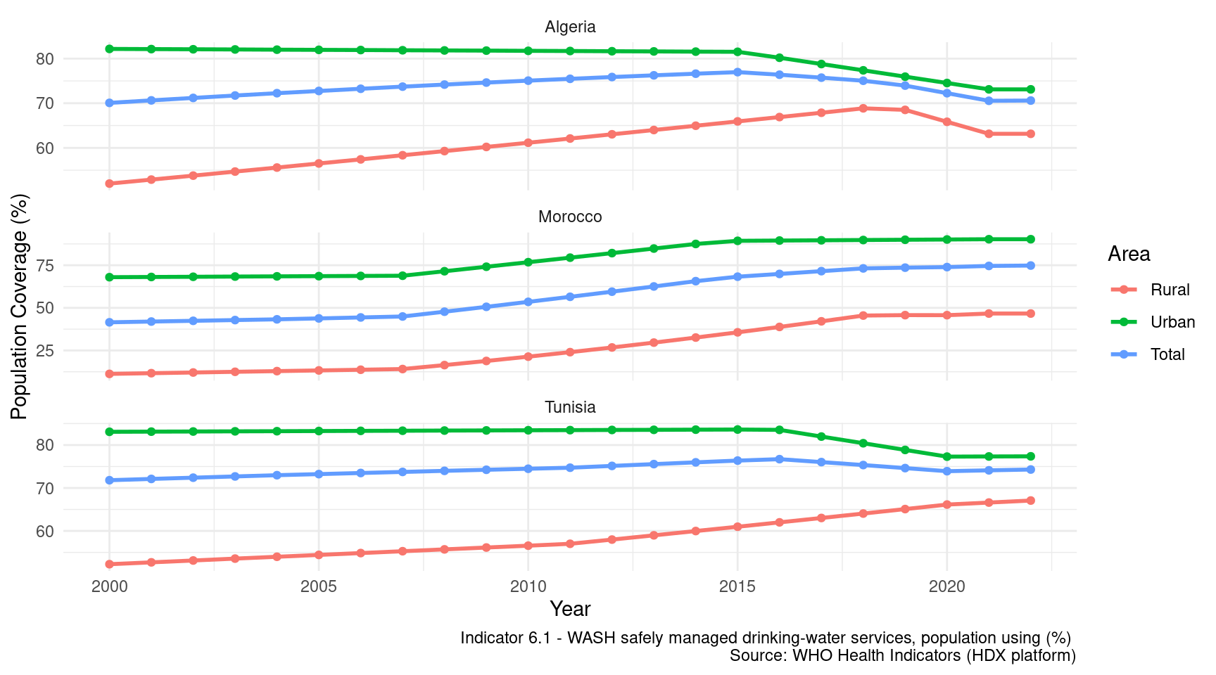 All three countries have made measurable progress since 2000; however, improvements have slowed considerably in recent years, with both Tunisia and Algeria experiencing a decline in access, indicating emerging challenges in maintaining water service quality and coverage, while Morocco has reached 75% of the population with safely managed drinking-water services. In all three cases, a persistent rural–urban gap remains, with rural coverage systematically below urban coverage despite overall national progress.