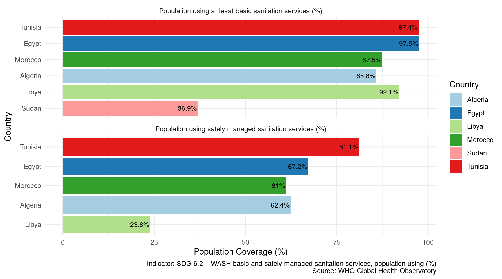 Basic sanitation coverage is high in most North African countries, but safely managed sanitation remains substantially lower, revealing major gaps in wastewater treatment and safe disposal.