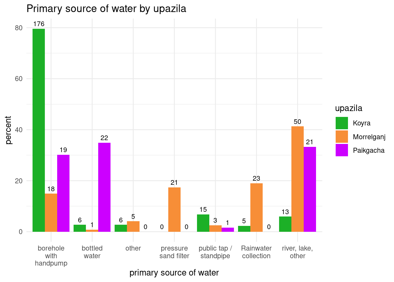 Figure 1 shows the primary source of water for residents in the three upzilas. The vast majority of respondents in Koyra get their water from handpumps, while only a few in the other two upazilas do. Responses from Paikgacha are split between boreholes, bottled water and bodies of water such as lakes and rivers. In Morrelganj, bodies of water are the most common water source.