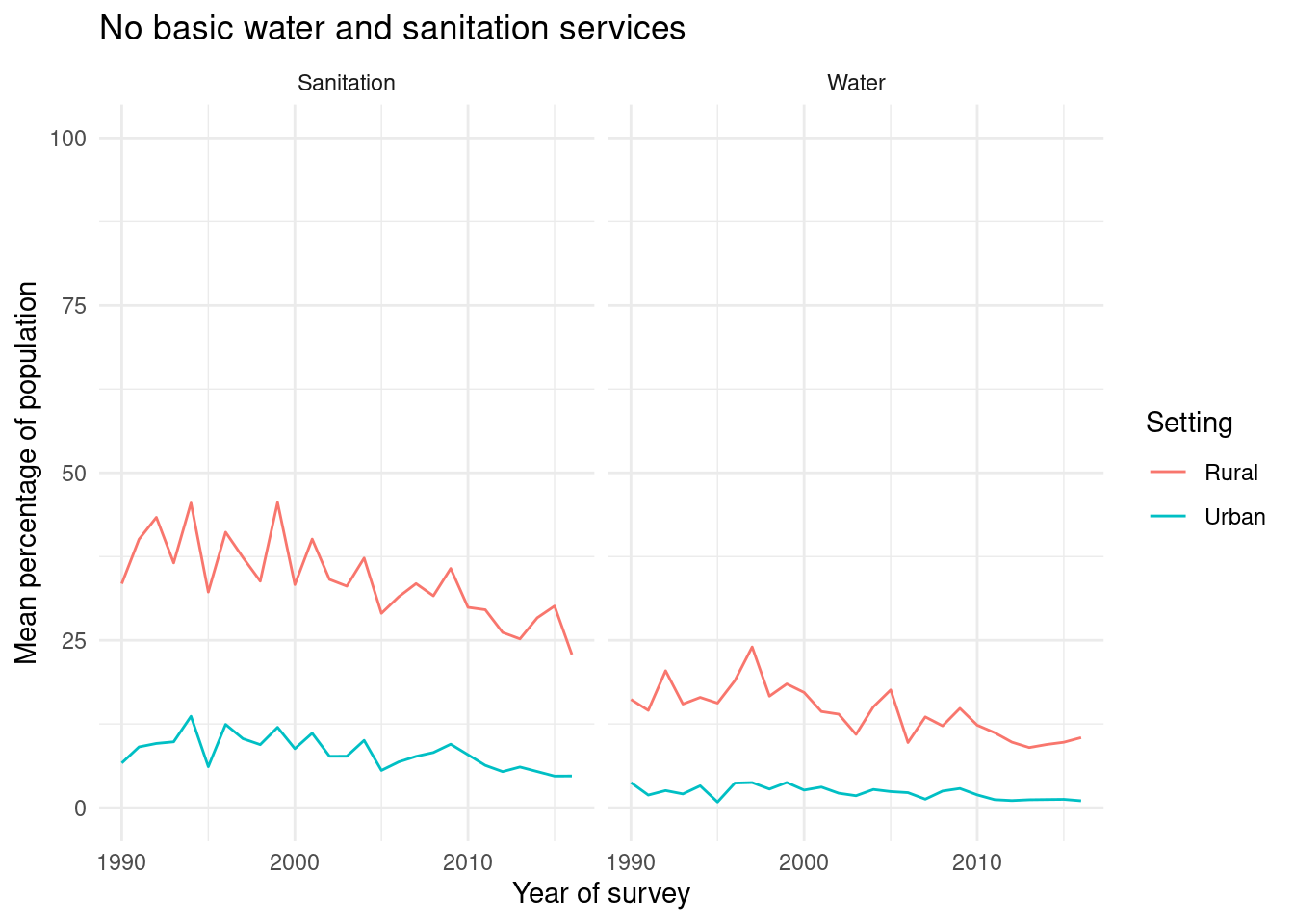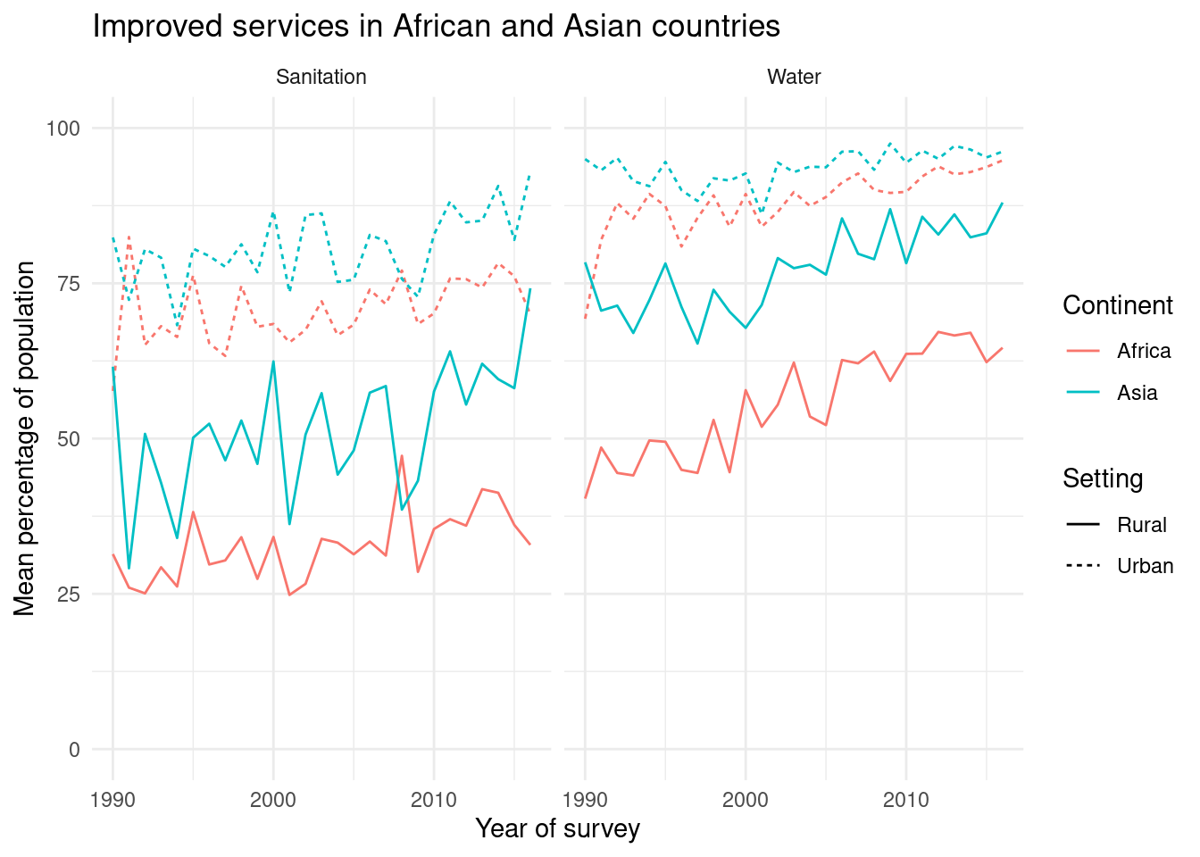 library(gt)Access to safe drinking water and sanitation remains unevenly distributed, with African and Asian countries facing some of the largest shortfalls relative to the Sustainable Development Goals. Using country-level data from the WHO/UNICEF Joint Monitoring Programme (downloaded June 2019), this capstone descriptively examines trends in improved, piped/sewered and no basic water and sanitation services for African and Asian countries between 1990 and 2016. Unweighted mean coverage by year, region, service type and urban/rural setting is summarised using tables and line plots. Results show rising coverage with improved services but consistently higher levels in urban than rural areas, a declining yet still elevated share of people without basic services in rural settings, and systematically higher coverage in Asia than in Africa, underscoring persistent inequalities and the need for accelerated progress, especially in African countries and rural areas.