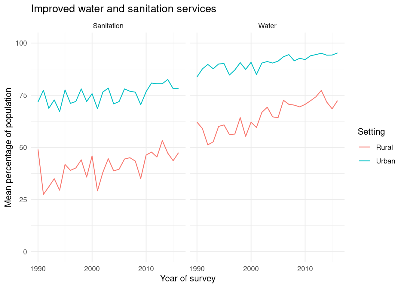 As shown in Figure 1, coverage with improved services has generally increased over time for both water and sanitation. Throughout the period, urban coverage remains substantially higher than rural coverage, especially for sanitation. Gains in rural sanitation coverage appear particularly marked from the early 2000s onwards, reflecting expansion from low initial levels.