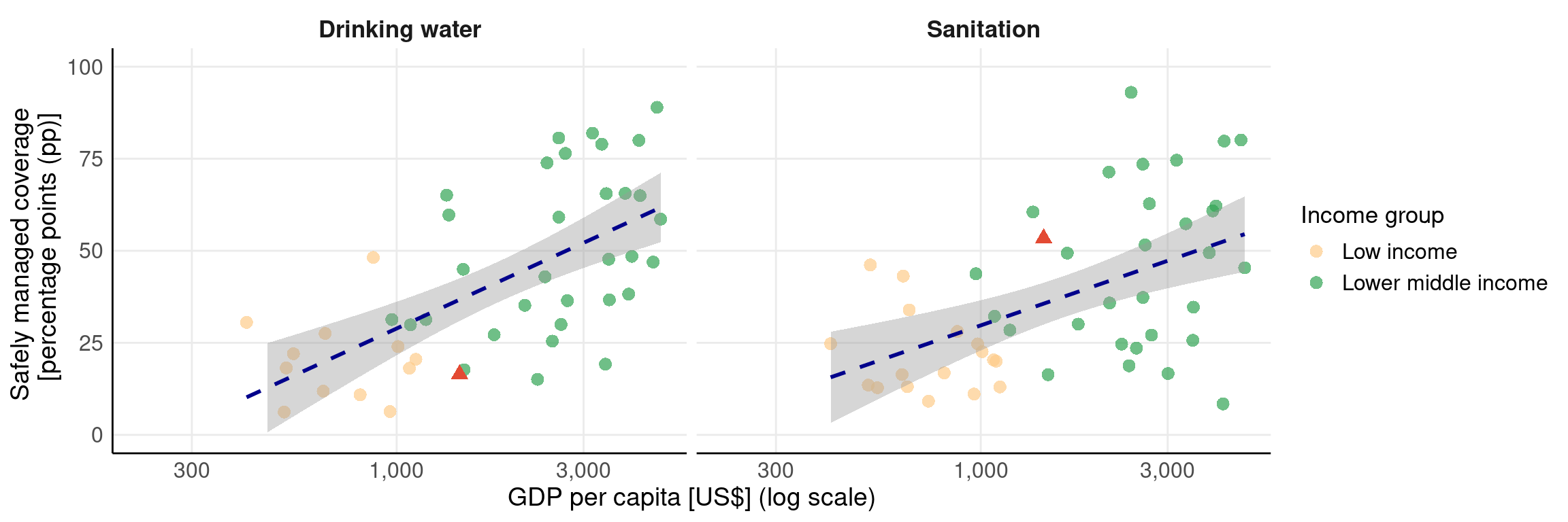 Drinking water performance depends on system durability and governance: The wide dispersion in safely managed drinking water at comparable income levels highlights the dominant role of service management, operation and maintenance, and water quality control. In Nepal, stricter JMP criteria combined with ageing, decentralised supply systems and environmental stresses (for example, earthquake and COVID-19) likely contributed to declining safely managed coverage despite expansion in basic services.