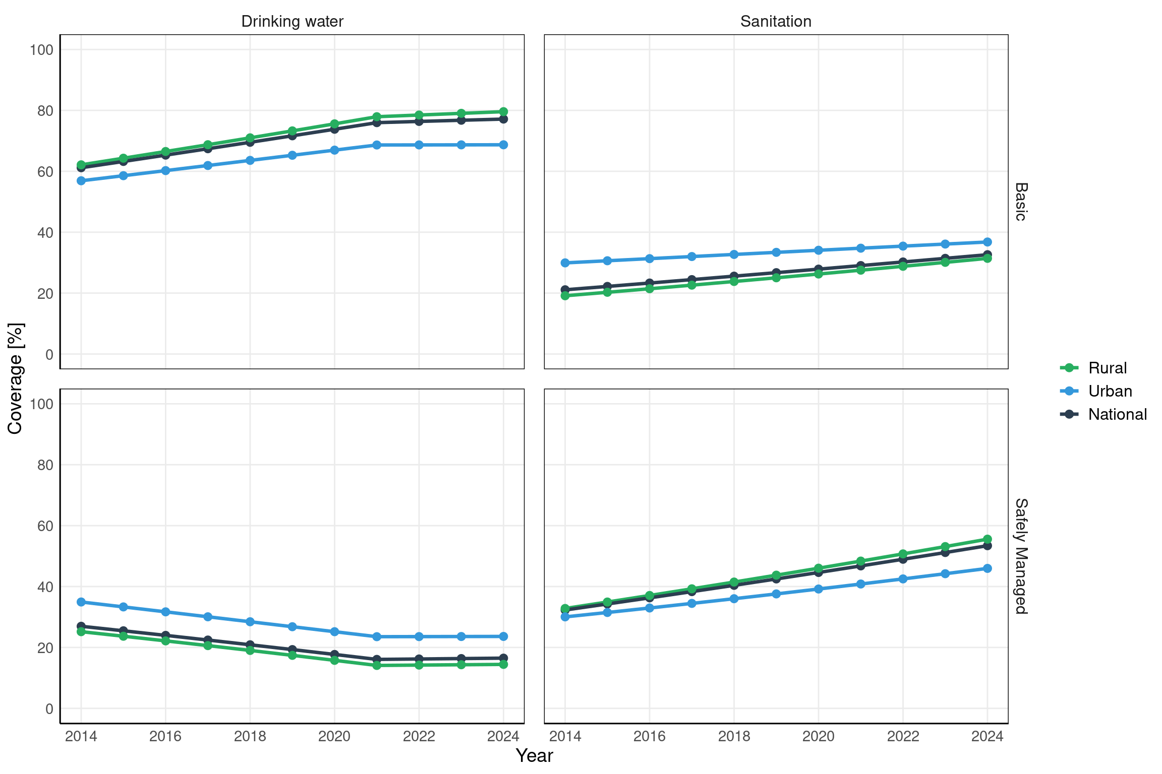 Sanitation demonstrates the opposite pattern across all residence types. Safely managed coverage improved steadily, with particularly strong gains in rural areas (from 32.3% in 2014 to 53.4% in 2024, a 21.1 pp increase) and urban areas (from 30.0% to 46.0%, 16.0 pp). National sanitation coverage rose from 31.7% to 52.7% (21.0 pp). Basic sanitation coverage increased modestly while safely managed coverage grew faster, resulting in a narrow safety gap. By 2024, safely managed sanitation coverage exceeded basic-only coverage across all residence types.