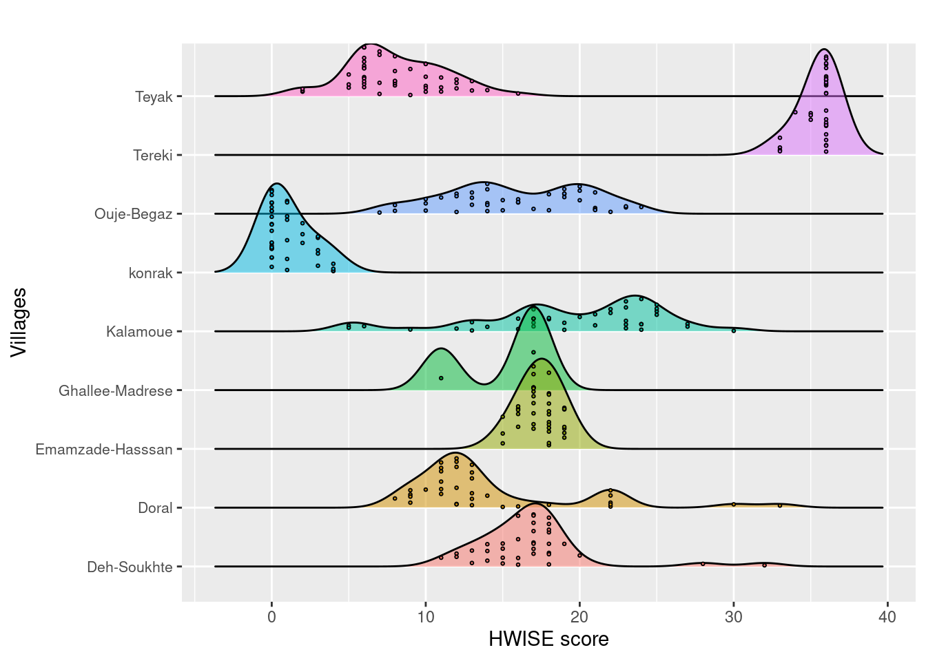 ggplot(processed_data,aes(x=hwiseScale,y=villageName,fill=villageName))+ geom_density_ridges(show.legend = FALSE,alpha = 0.5,,jittered_points = TRUE,point_alpha=1,point_shape=21,point_size = 0.5)+ scale_colour_colorblind()+ theme(axis.text.y = element_text(size = 8))+