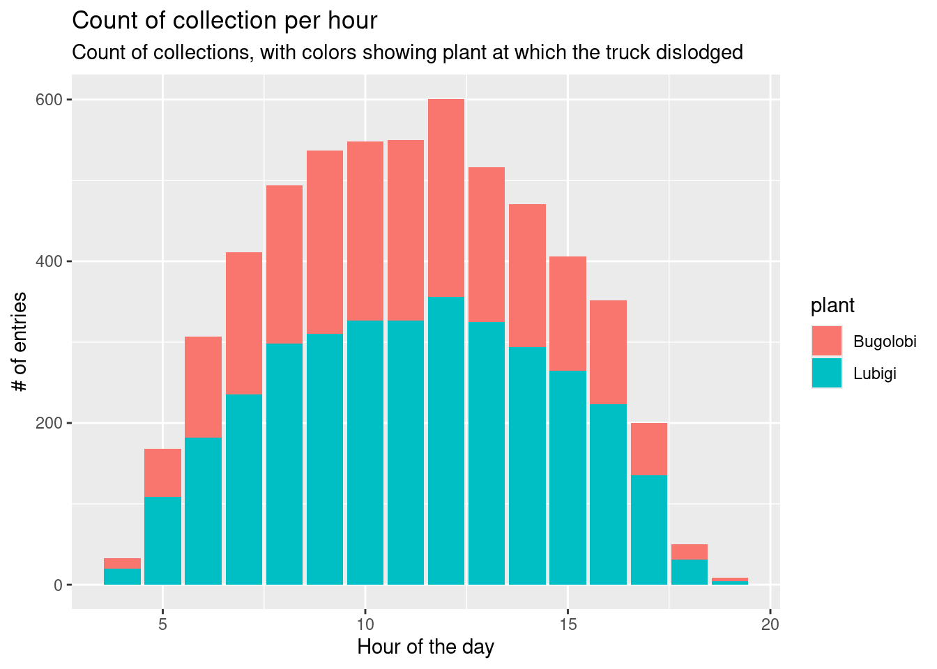 By counting timestamps and grouping them per hour of the day one can observe the time most collections are taking place (see Figure 3.6). Clearly it can be see most activity takes place during daytime and not at night. It starts to get busy from 5:00 in the morning and getting to almost no activity after 18:00. It also looks like both plant are equally used for dislodging over the whole day. So no correlation of collection time and dislodging location can be observed.