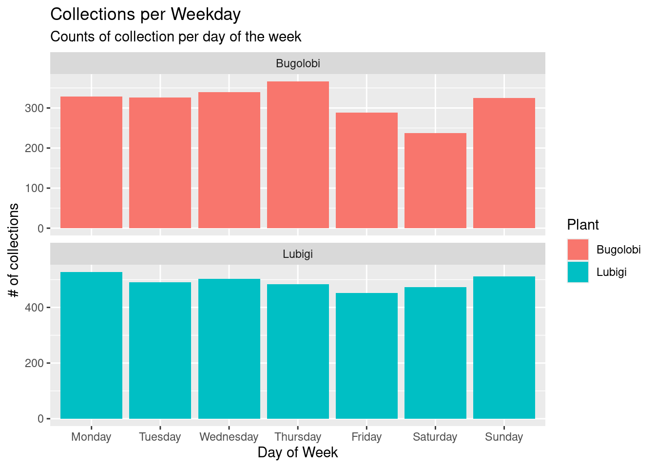 Figure 3.5 plots the counts of collections per day of week. Secondary the colour in the graph indicates whether at which of the dislodging plants the sludge was dumped. For the Lubigi plant every day, also during weekends, seems constant. For the Bugolobi plant one can see that Thursdays seems to be the busiest followed two more quiet days on Friday and Saturday.