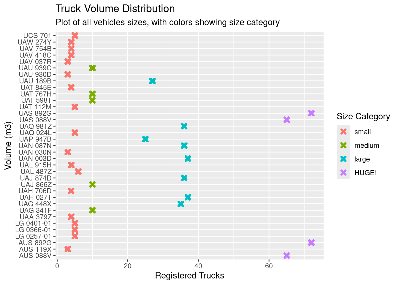 The second dataset called ‘trucks’ can be used as dimension table for the trips data to retrieve meta data from the trucks. In this case only the volume. In total 35 trucks are registered and each has a reported volume as an attribute: