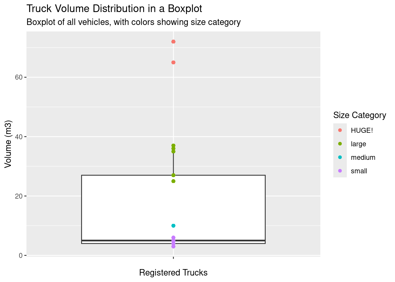 trucks_raw <- read_csv(here::here("data/raw/trucks.csv"))Table 2.2 shows the dictionary of the trucks set. This is a more simple table containing meta data on the truck. It only contains 2 variables. The first is the ‘numberplate’ which can function as key to link to the trips dataset and the second variable is the volume of the specific truck in m3.