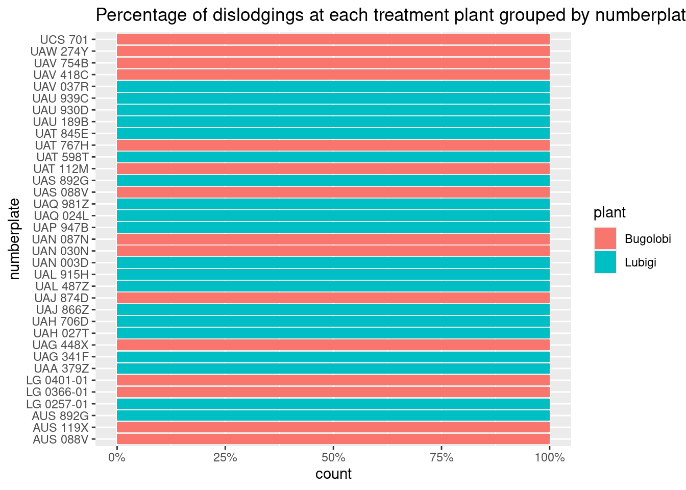 labs(title = "Percentage of dislodgings at each treatment plant grouped by numberplate")
