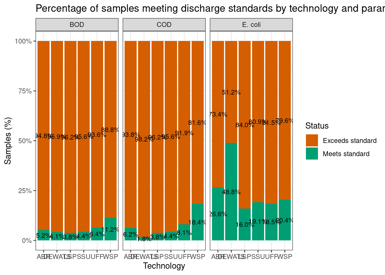 title = "Percentage of samples meeting discharge standards by technology and parameter",