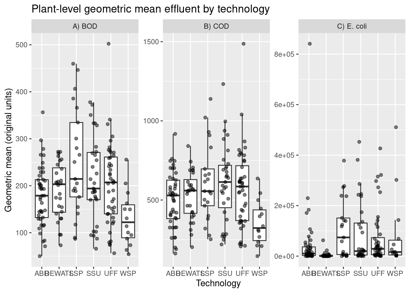 Raw effluent monitoring data were imported from CSV files and restricted to samples with non‑missing BOD, COD, and E. coli, resulting in 1,163 observations for analysis. Data were summarised by camp and technology to quantify the number of plants and monitoring coverage, and plant‑level geometric means were calculated from log₁₀‑transformed BOD, COD, and E. coli values. Because all three parameters were strongly right‑skewed and non‑normal, subsequent analyses used log‑transformed values, geometric means, and non‑parametric tests (Kruskal–Wallis with Dunn post‑hoc) for comparisons between technologies.