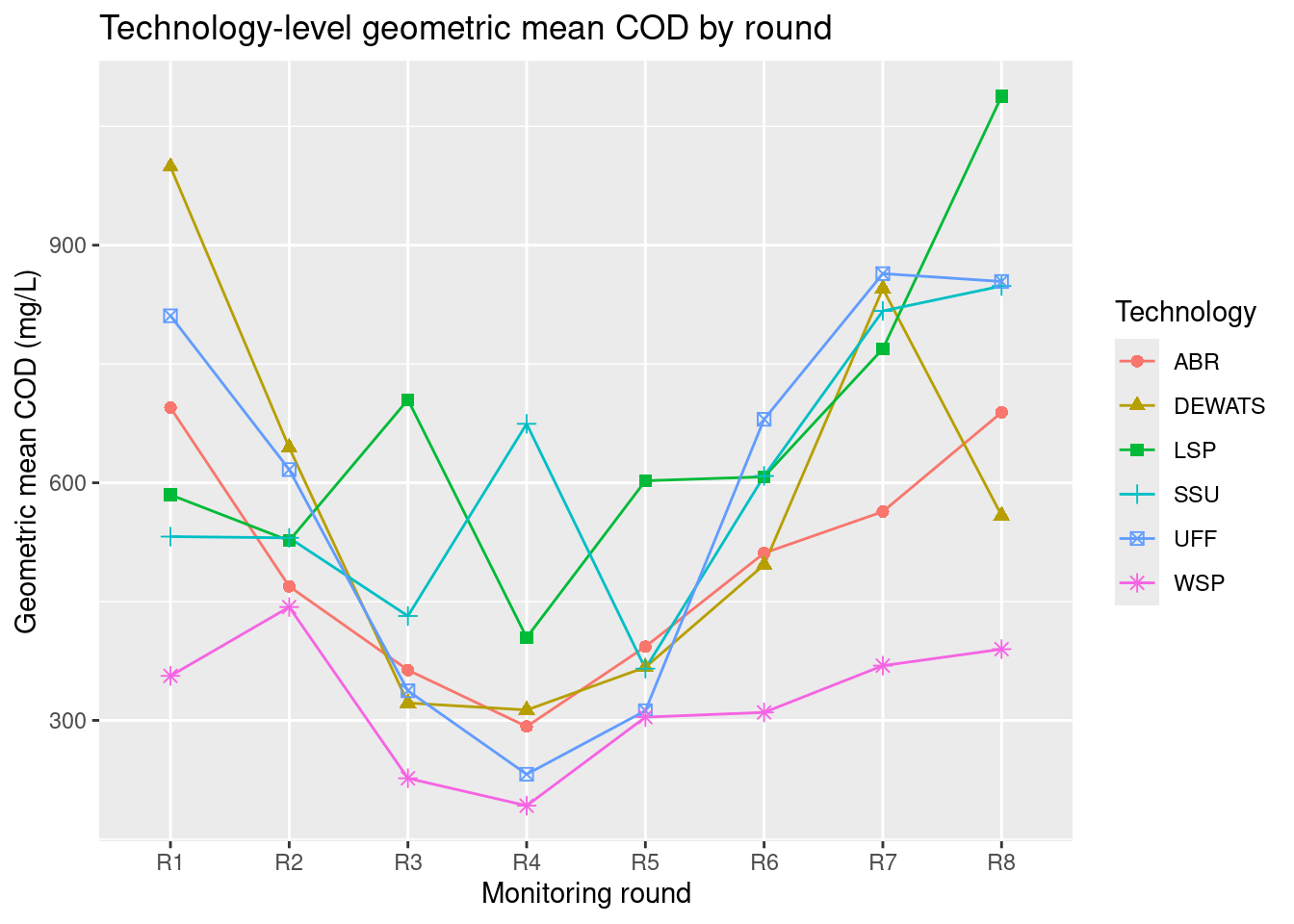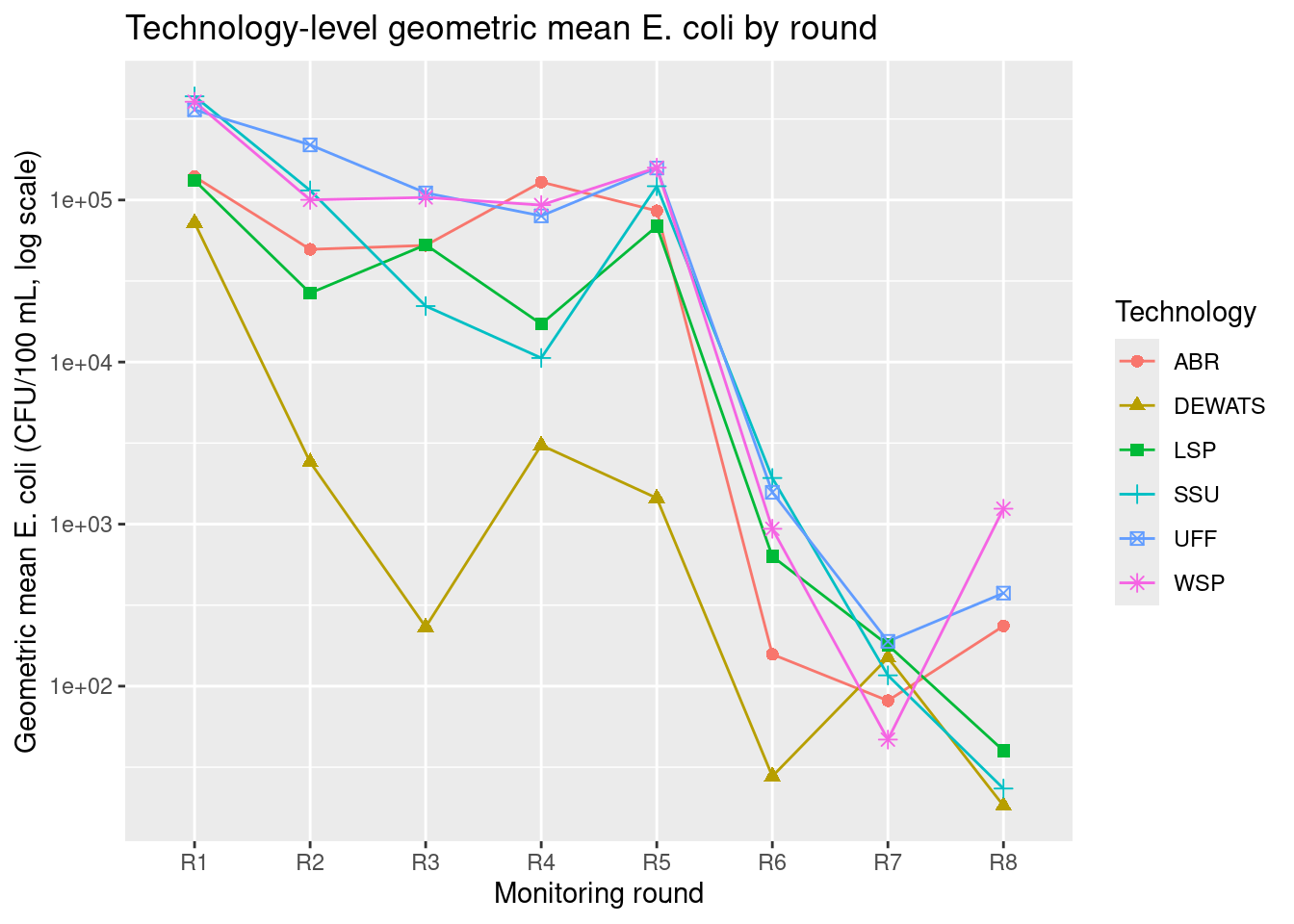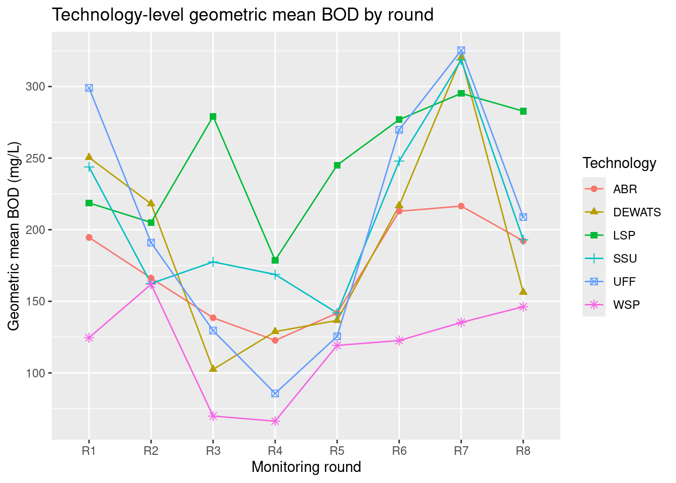 library(here)This project analyzes four years of fecal sludge effluent quality data from 183 fecal sludge treatment plants (FSTPs) operating in the Rohingya refugee camps. These facilities use six different decentralized treatment technologies, with effluent samples collected across eight monitoring rounds.