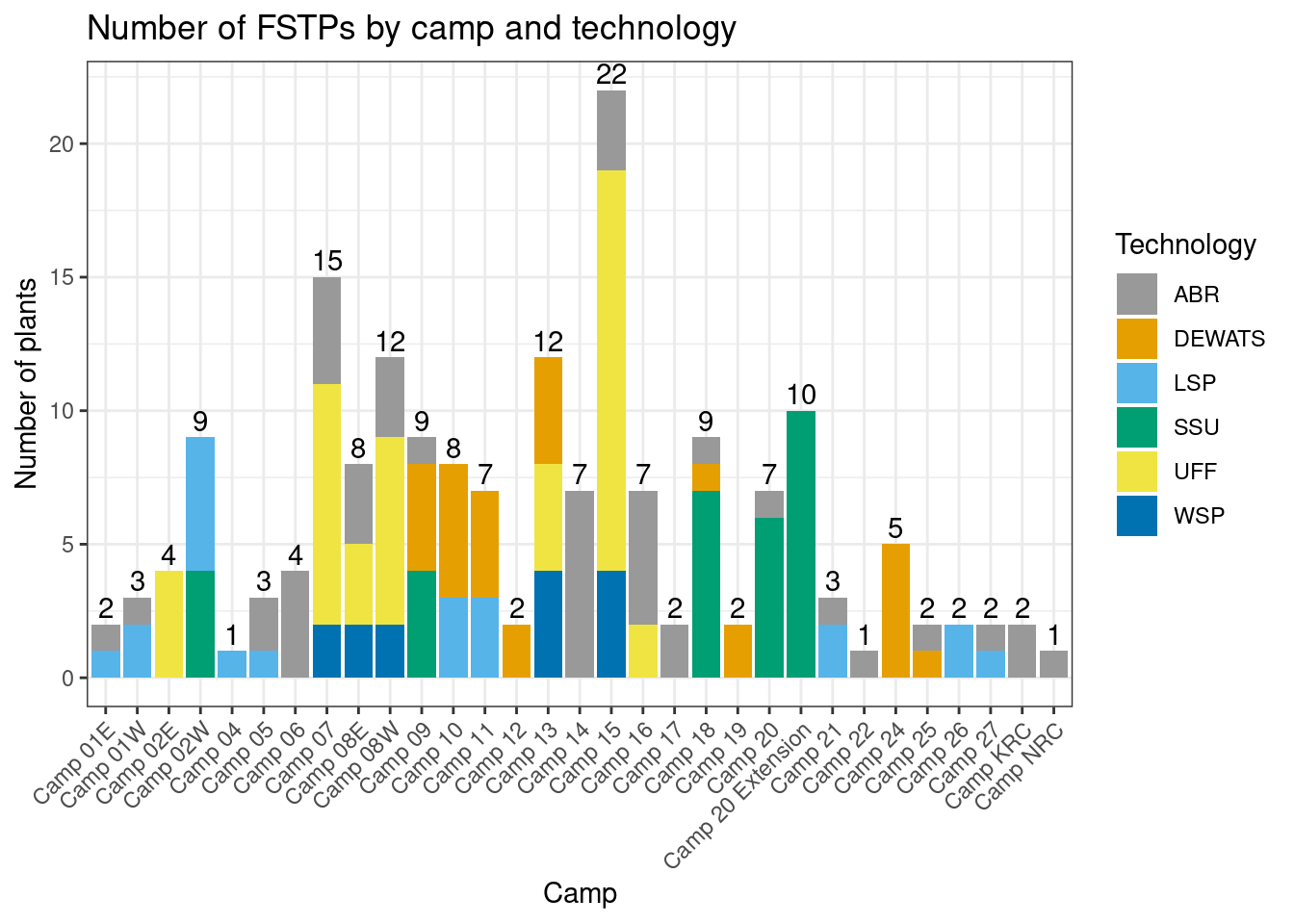 Figure 1 shows the number of FSTPs by camp and technology. Camps vary widely in both the number and type of FSTPs: some camps have only one or two plants of a single technology, whereas others have more than 10 plants and a mixture of several technologies. Important note: The numbers of plants shown for each camp do not represent all FSTPs present in the camps. This study includes only plants with monitoring data spanning more than one year, or with at least four sampling rounds. Because reliable information on the establishment or start‑up dates of the plants was not available.