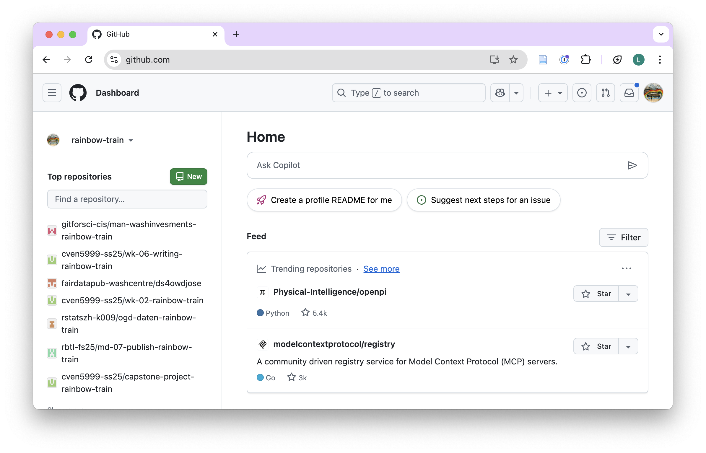 You can search for your repository by typing your username in the search bar just below the Repository heading. See “rainbow-train” in screenshot.