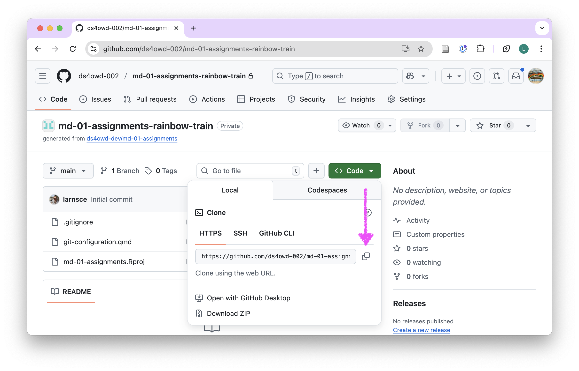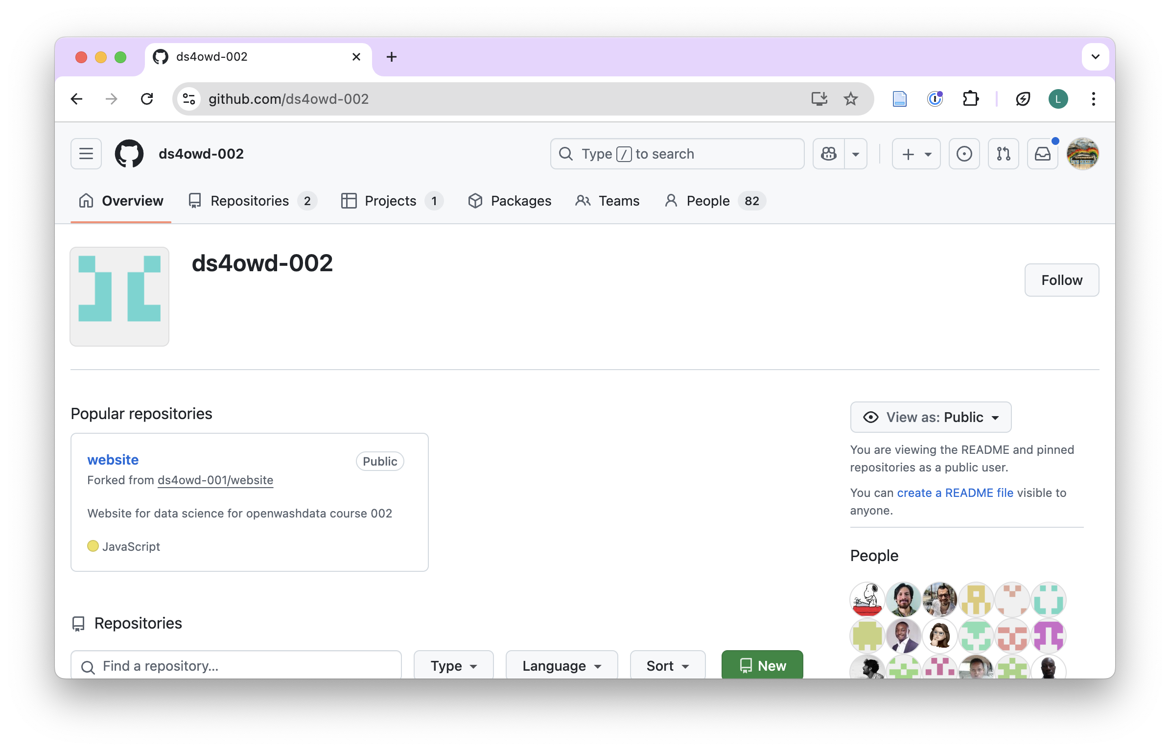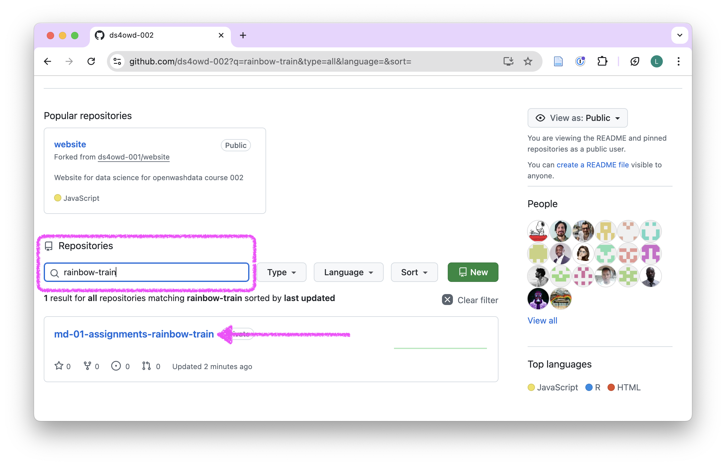 - Navigate to the GitHub organization for the course: https://github.com/ds4owd-002