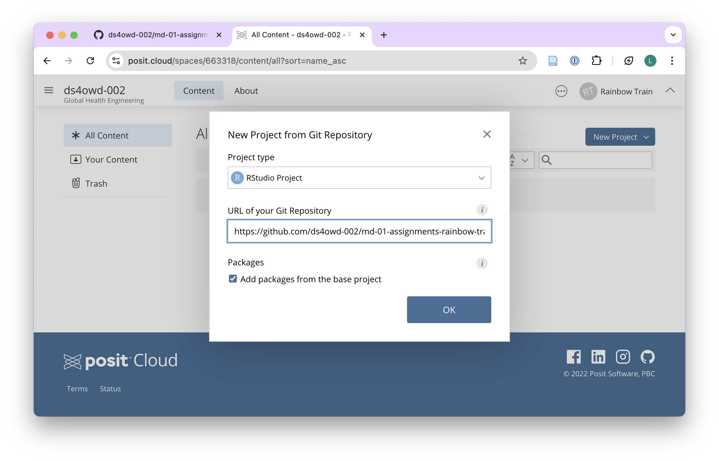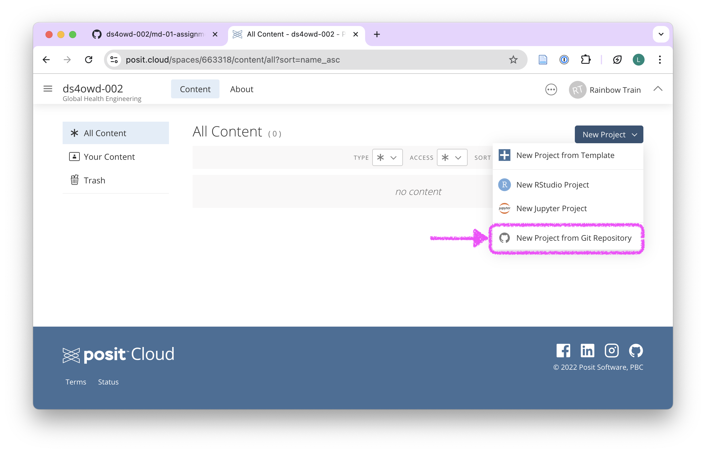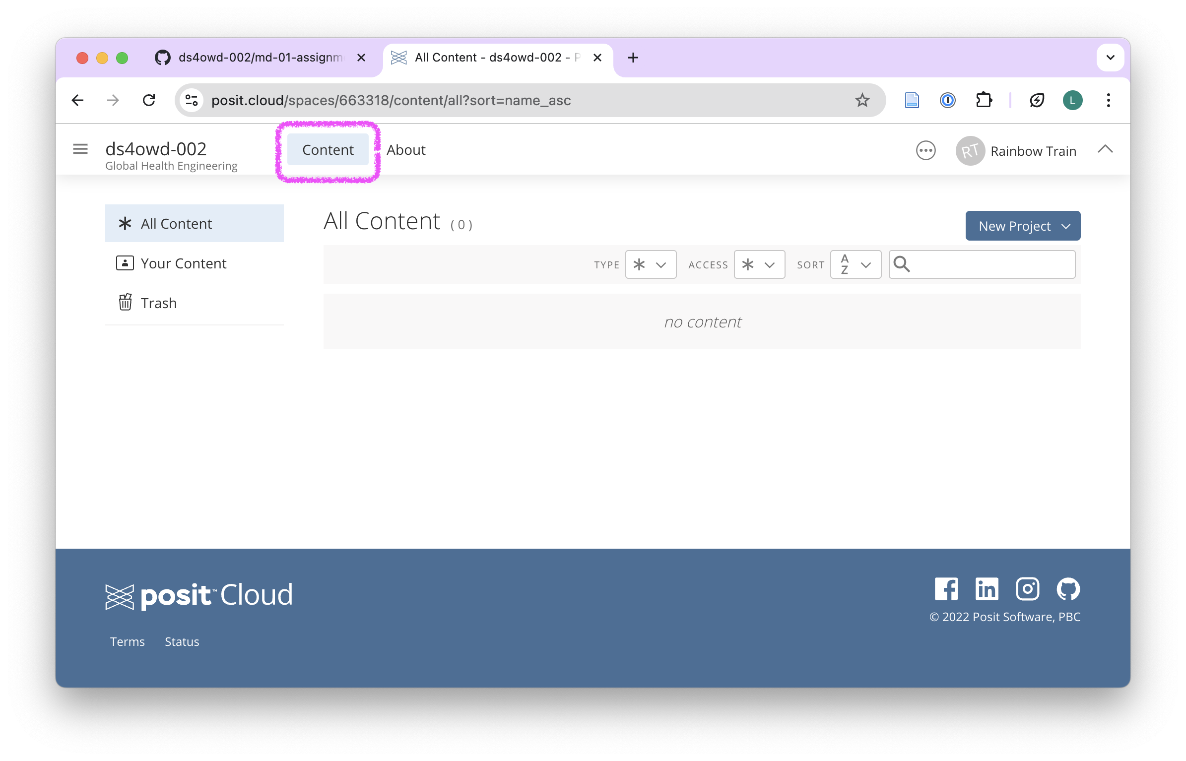 - Open the Content tab of the ds4owd-002 workspace on Posit Cloud: https://posit.cloud/spaces/663318/content/all?sort=name_asc