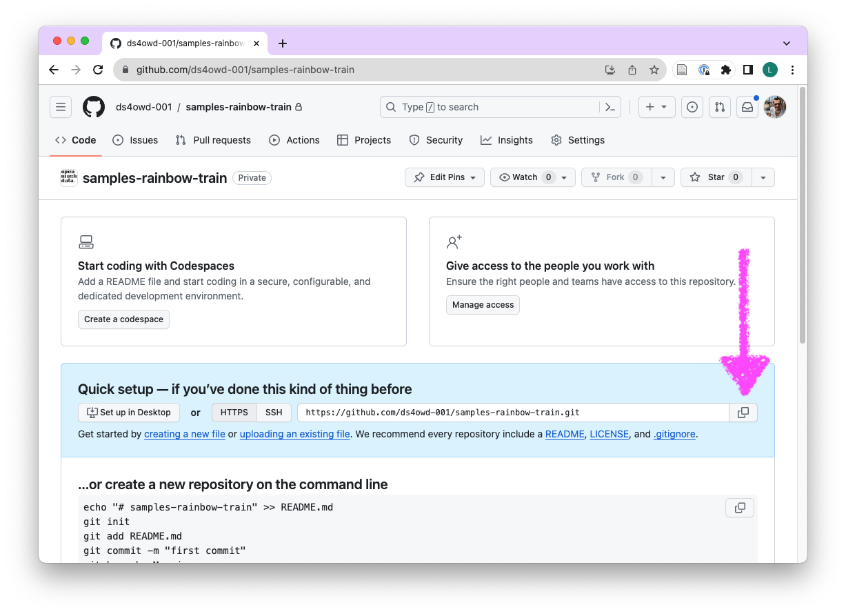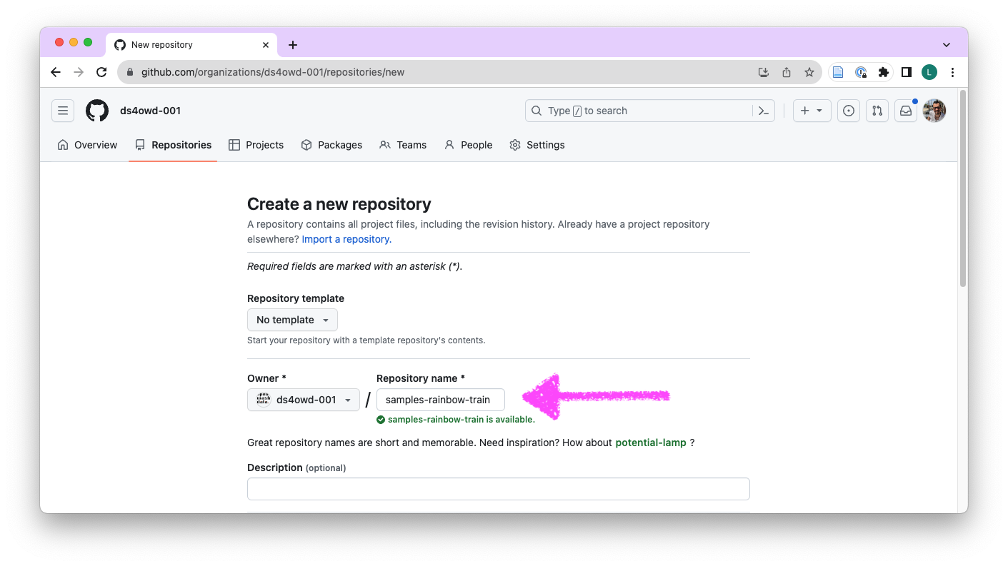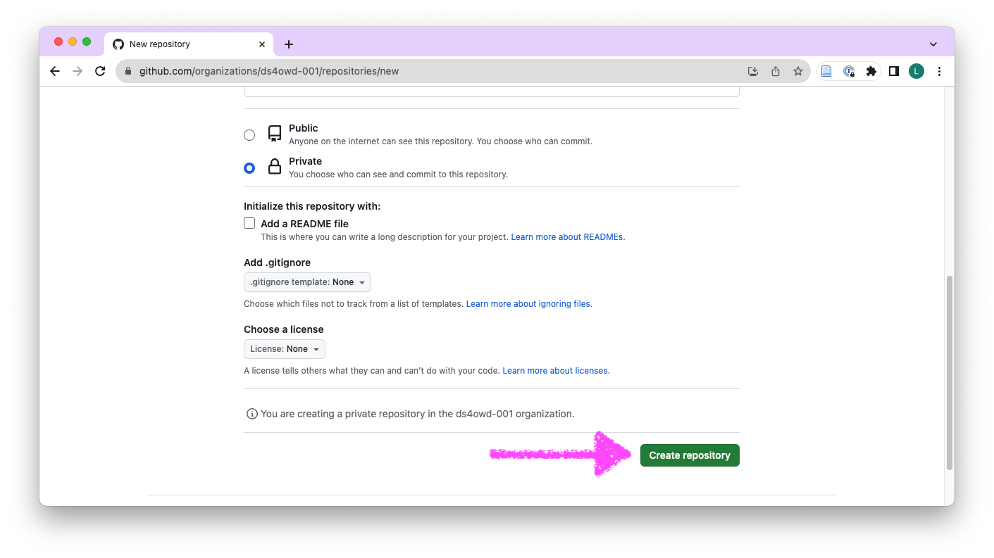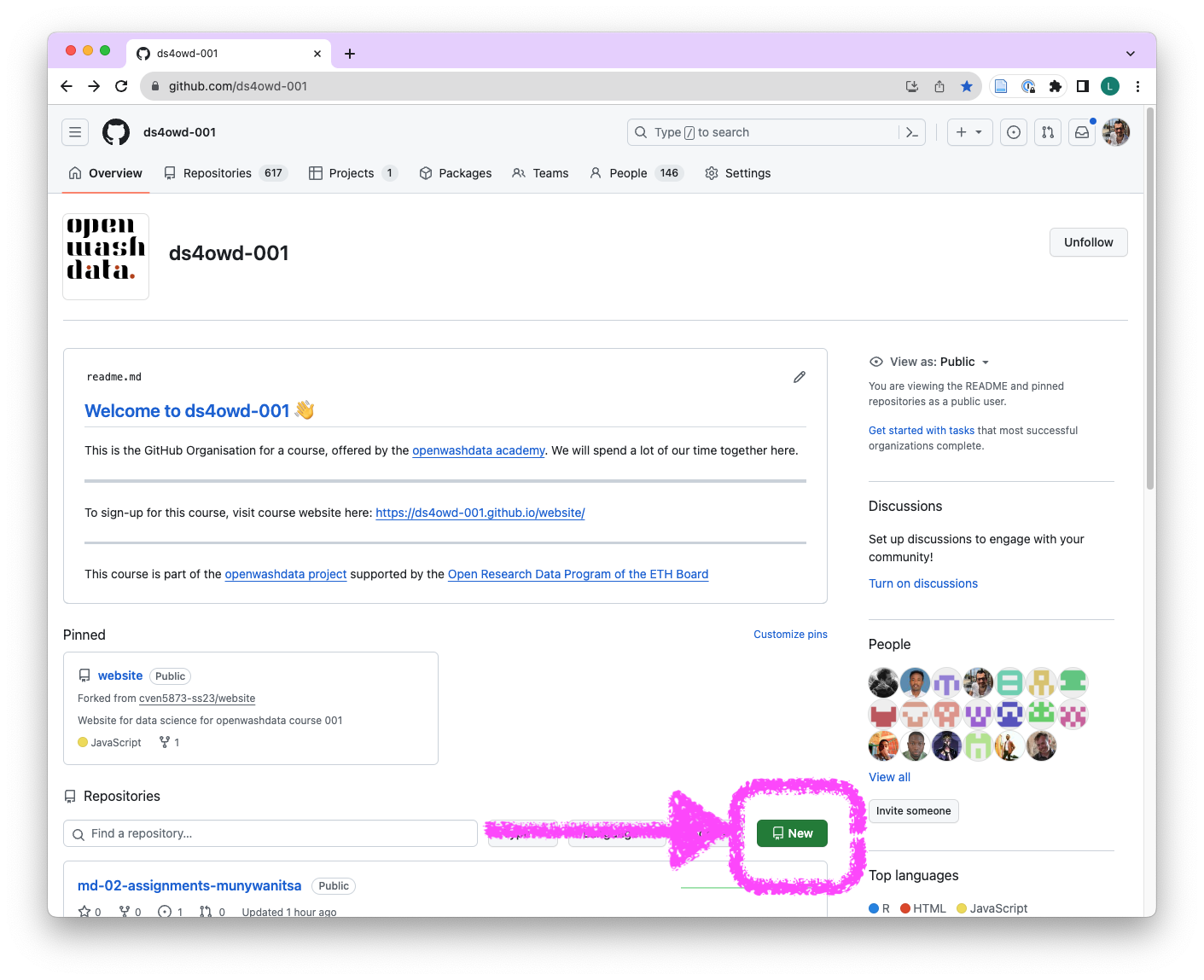 - Navigate to the GitHub organization for the course: https://github.com/ds4owd-002