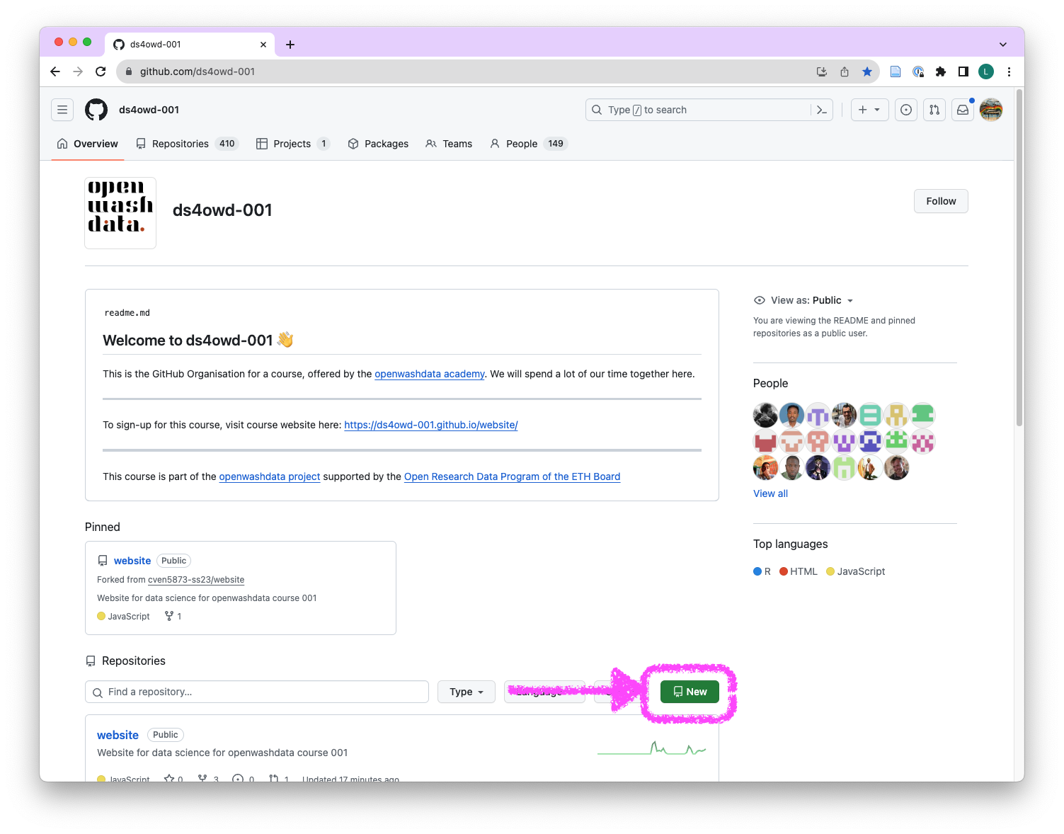 - Open the GitHub Organisation for the course <https://github.com/ds4owd-002>