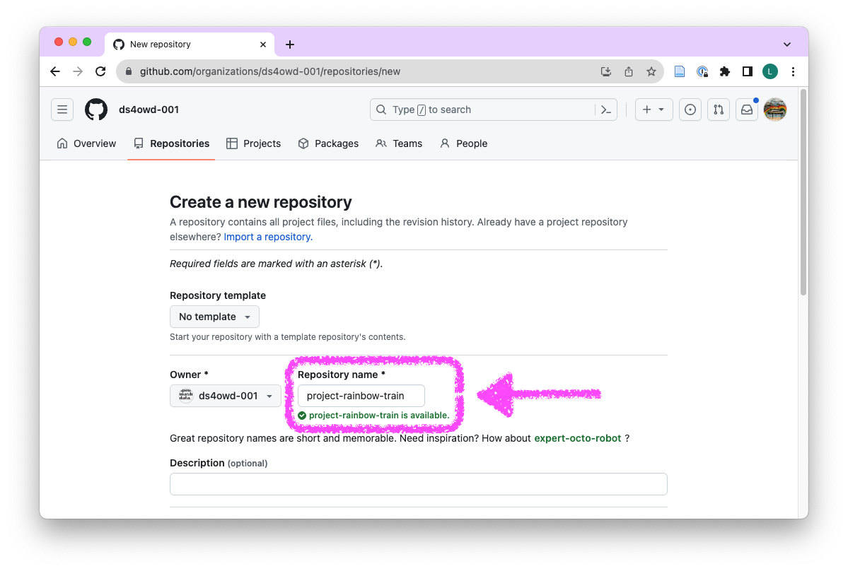 . Replace username with your GitHub username. Avoid using spaces. For example:project-rainbow-train