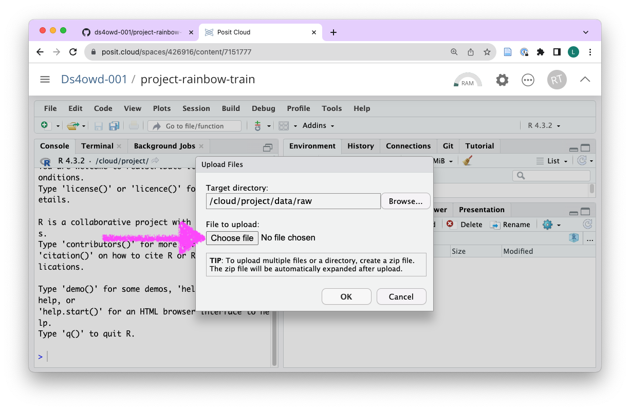 - Use the Files tab in the bottom right window to upload your identified data from Task 1 into the
