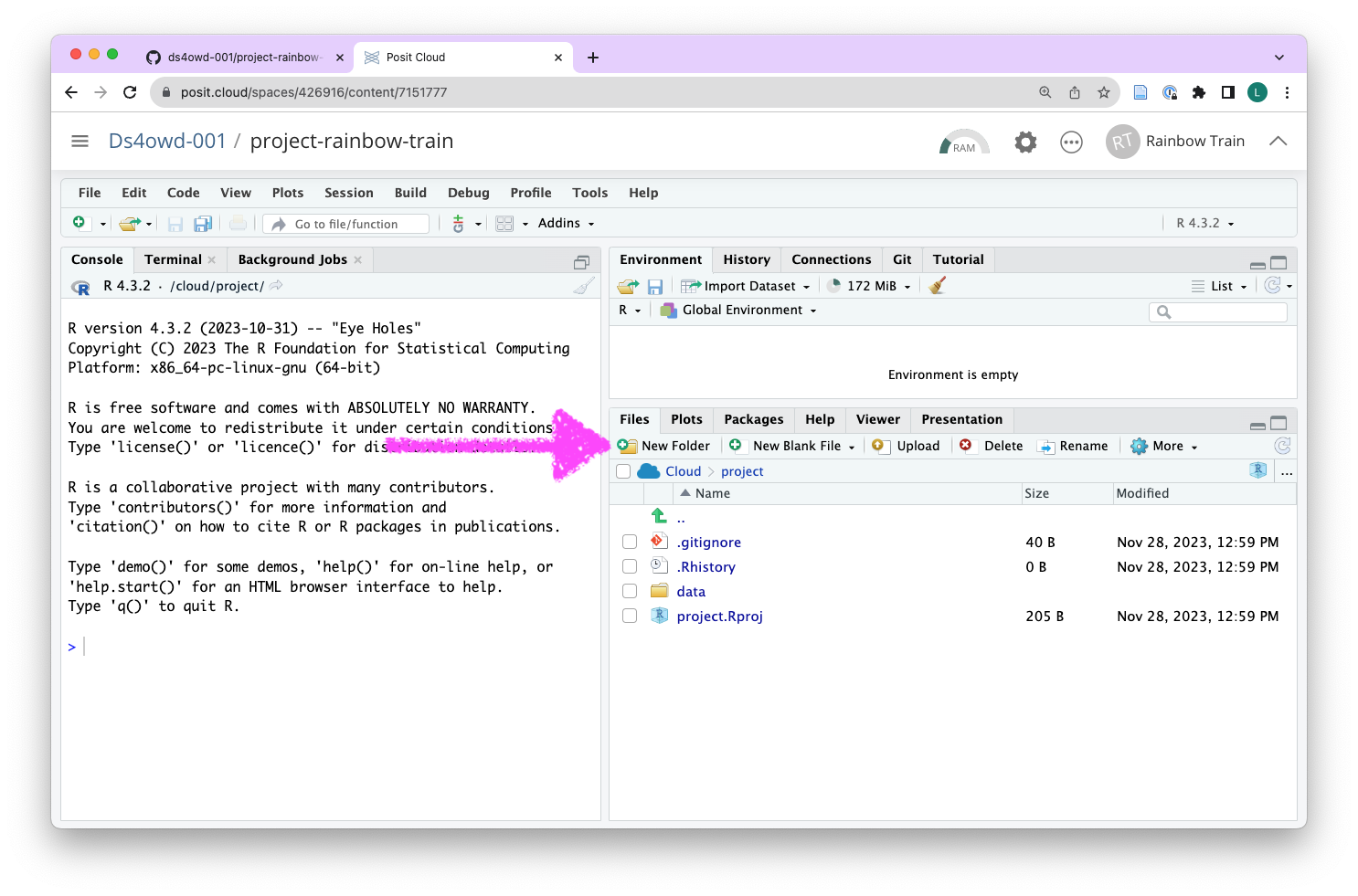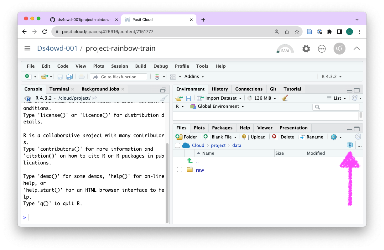 - Navigate back to the root of your project folder by a click on the blue R cube.