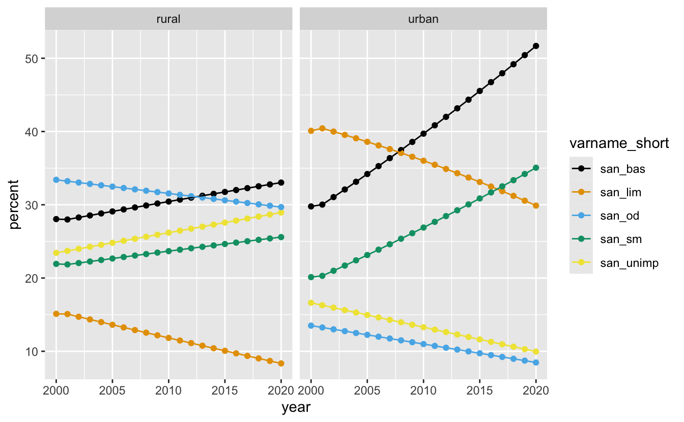 filter()residence == "national", etc. What to do with the datasanitation_national_2020_sm<-|>filter() function to create a subset from the sanitation data containing urban and rural estimates for Nigeria.sanitation_nigeria_urban_ruralGreat for timeseries data