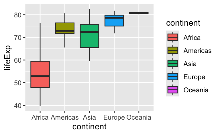 select: pick columns by namearrange: reorder rowsfilter: pick rows matching criteriarelocate: changes the order of the columnsmutate: add new variablessummarise: reduce variables to valuesgroup_by: for grouped operationsfilter().data =year == 2007 What to do with the datafilter().data = Does not need to be spelled outyear == 2007filter().data =year == 2007<- Assigns the result to an objectgapminder_2007 Name of the object that stores resultfilter().data =year == 2007gapminder_2007<-|> Passes the result into the first argument of the next functionRules of dplyr functions: